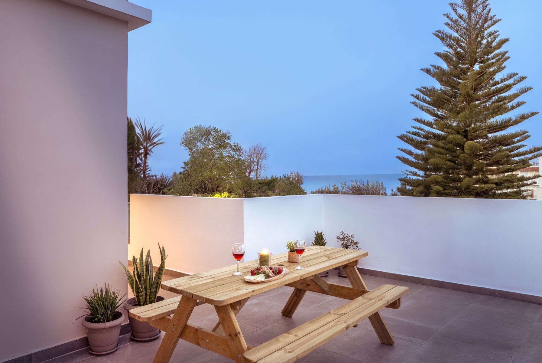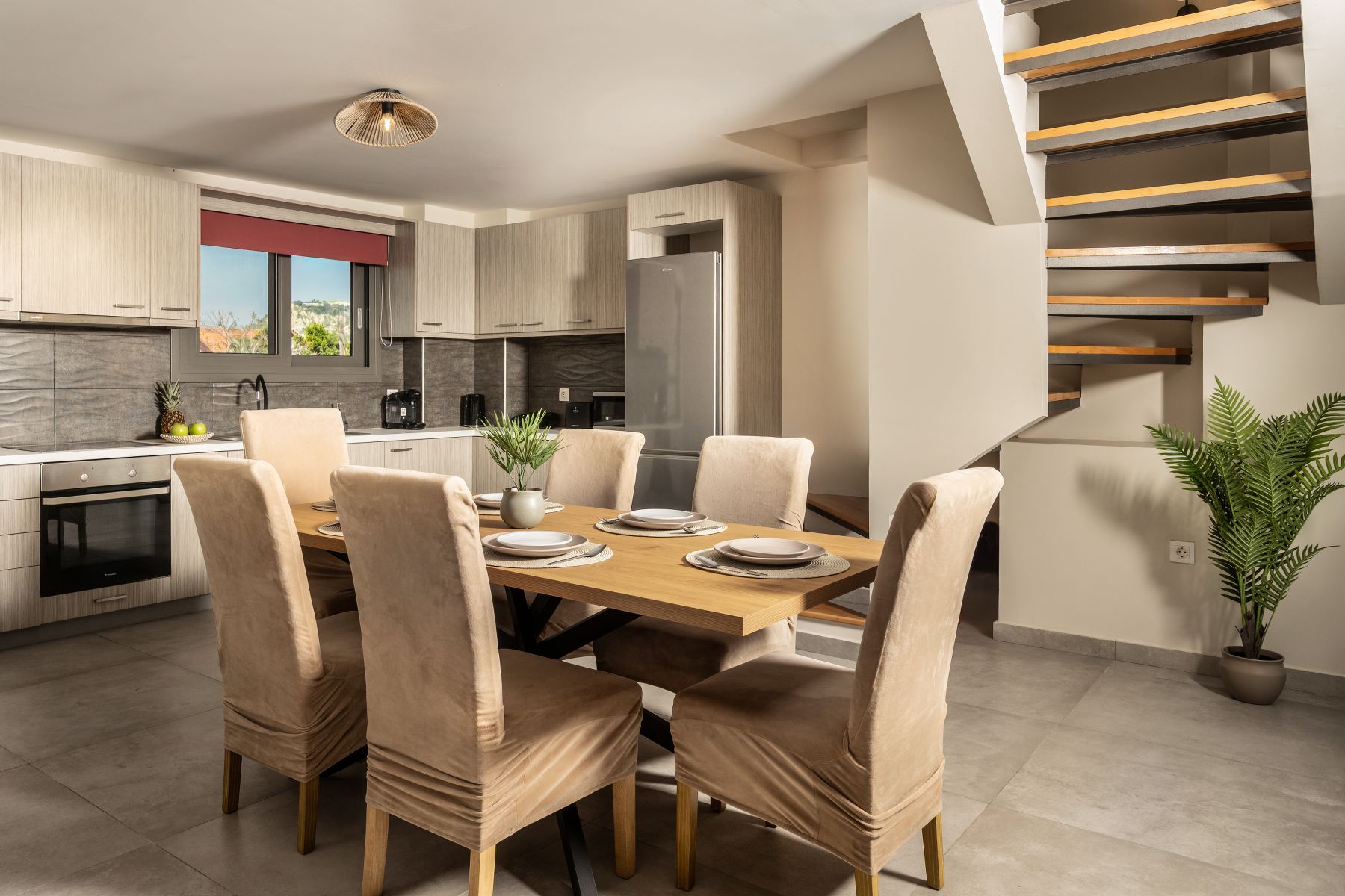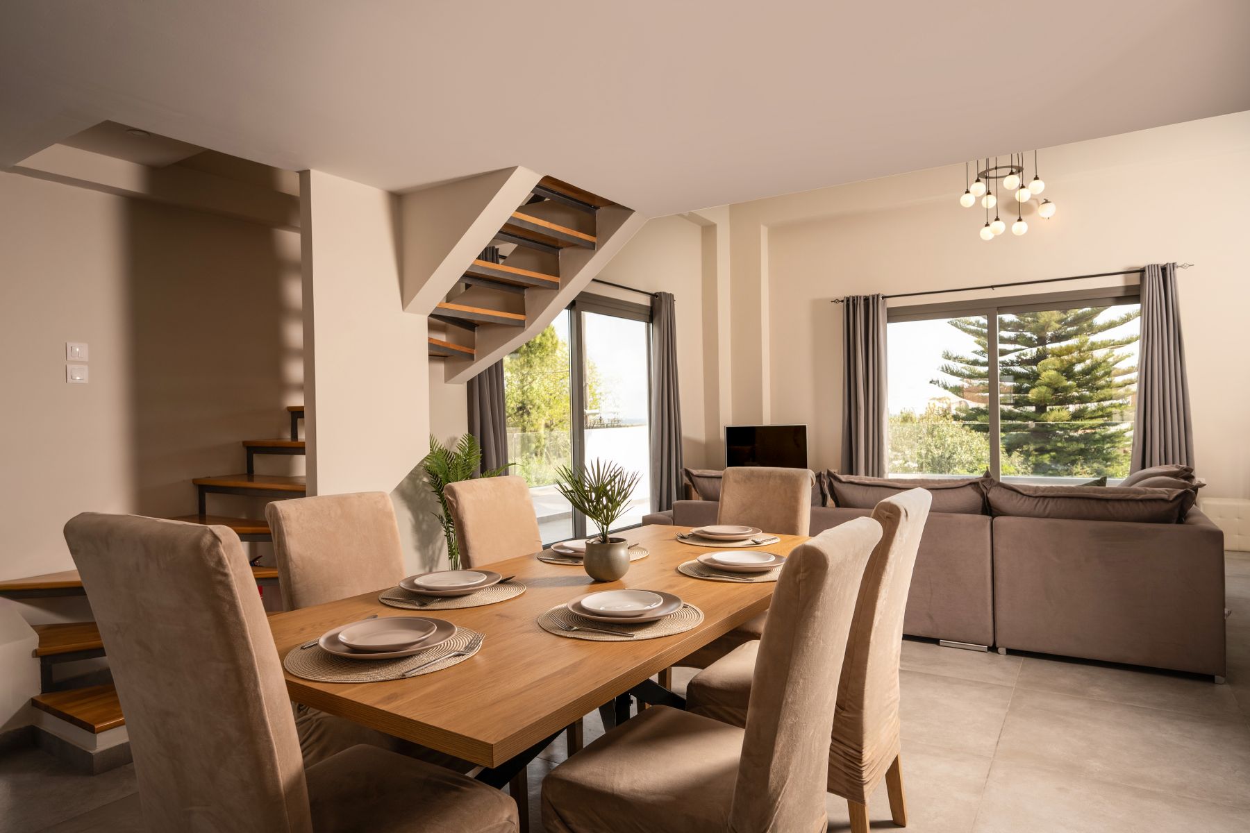 The ground floor features a comfortable living area with big windows that allow the natural light to enter the house, fully equipped kitchen, and dining space as well as a bedroom with a queen bed, and a shower-equipped bathroom. Upstairs, two bedrooms with twin beds each and an additional shared shower bathroom await. The maisonette also features an inviting outdoor veranda, complete with table, chairs, and umbrella, offering guests the perfect spot to enjoy the surroundings.