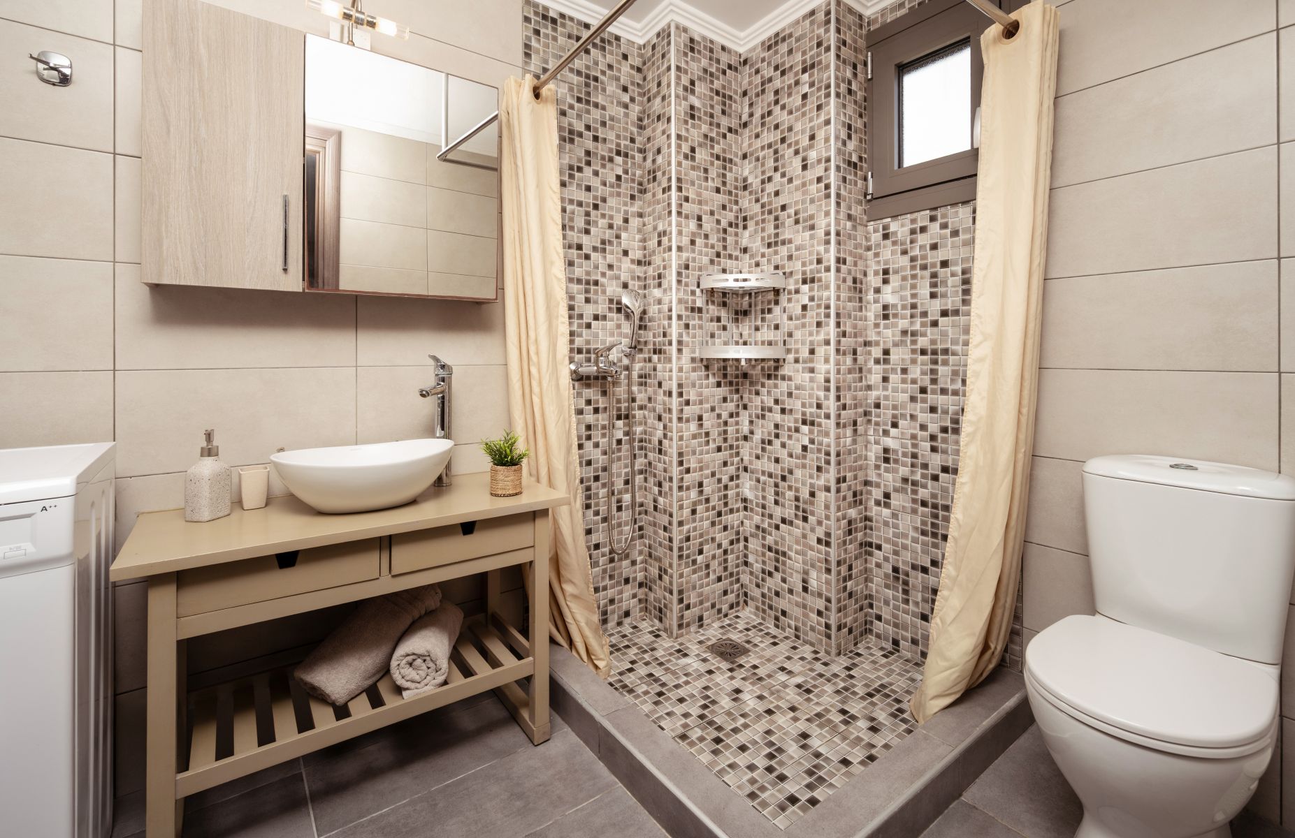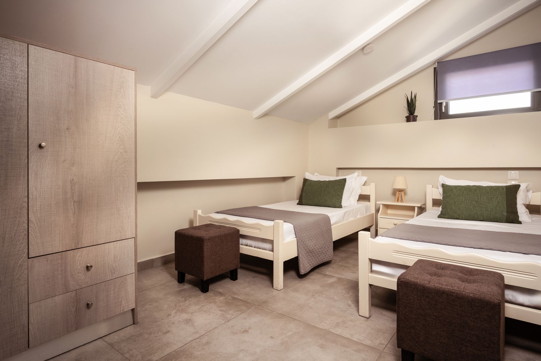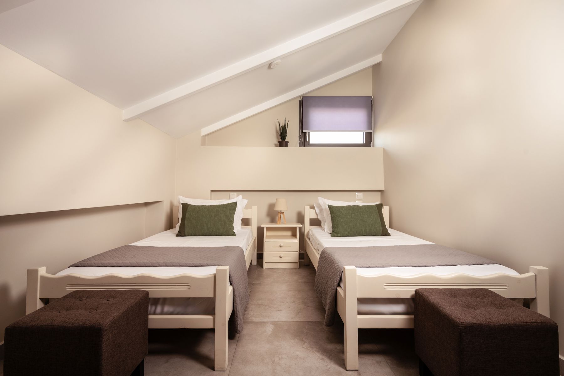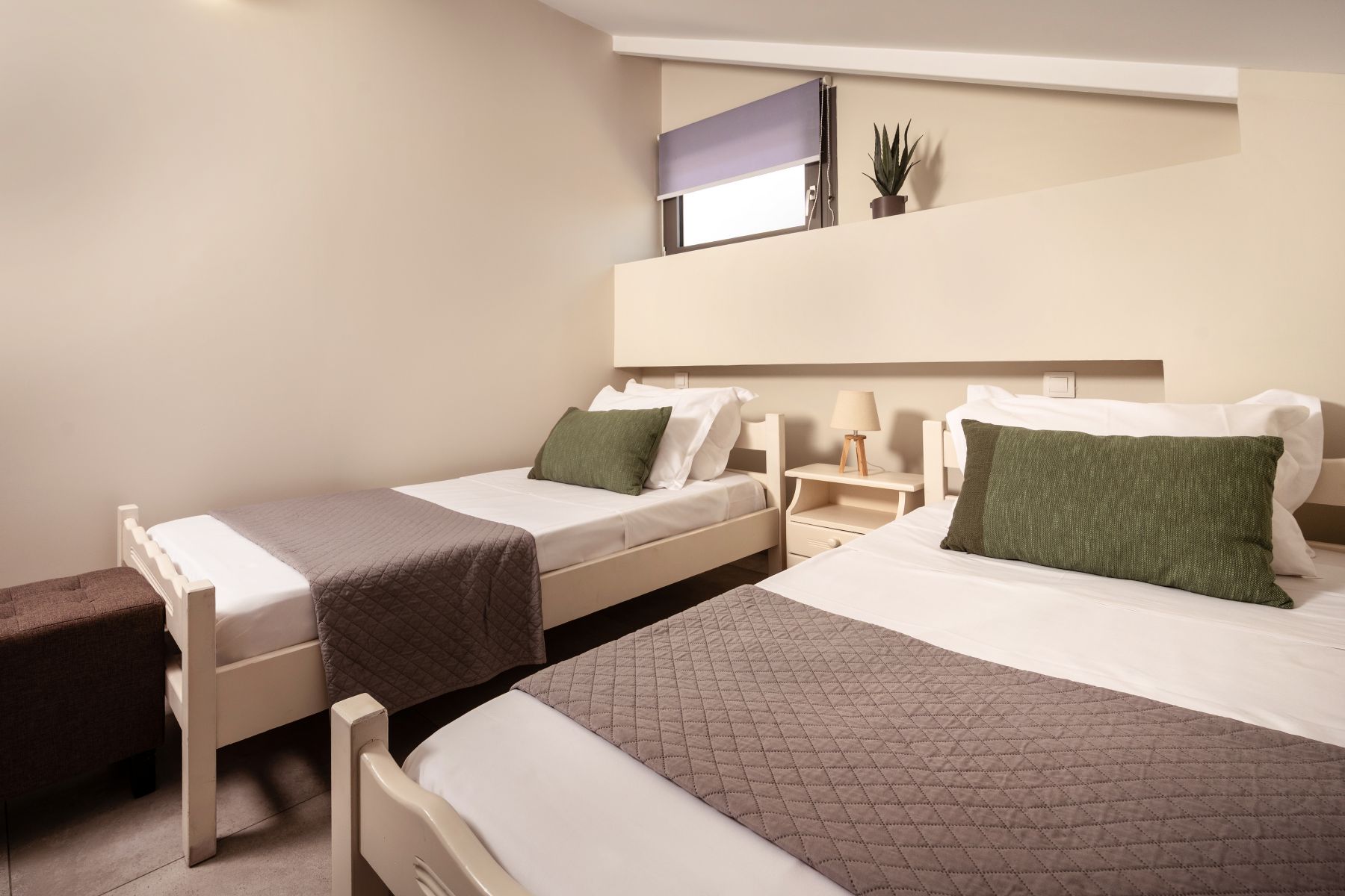 The ground floor features a comfortable living area with big windows that allow the natural light to enter the house, fully equipped kitchen, and dining space as well as a bedroom with a queen bed, and a shower-equipped bathroom. Upstairs, two bedrooms with twin beds each and an additional shared shower bathroom await. The maisonette also features an inviting outdoor veranda, complete with table, chairs, and umbrella, offering guests the perfect spot to enjoy the surroundings.